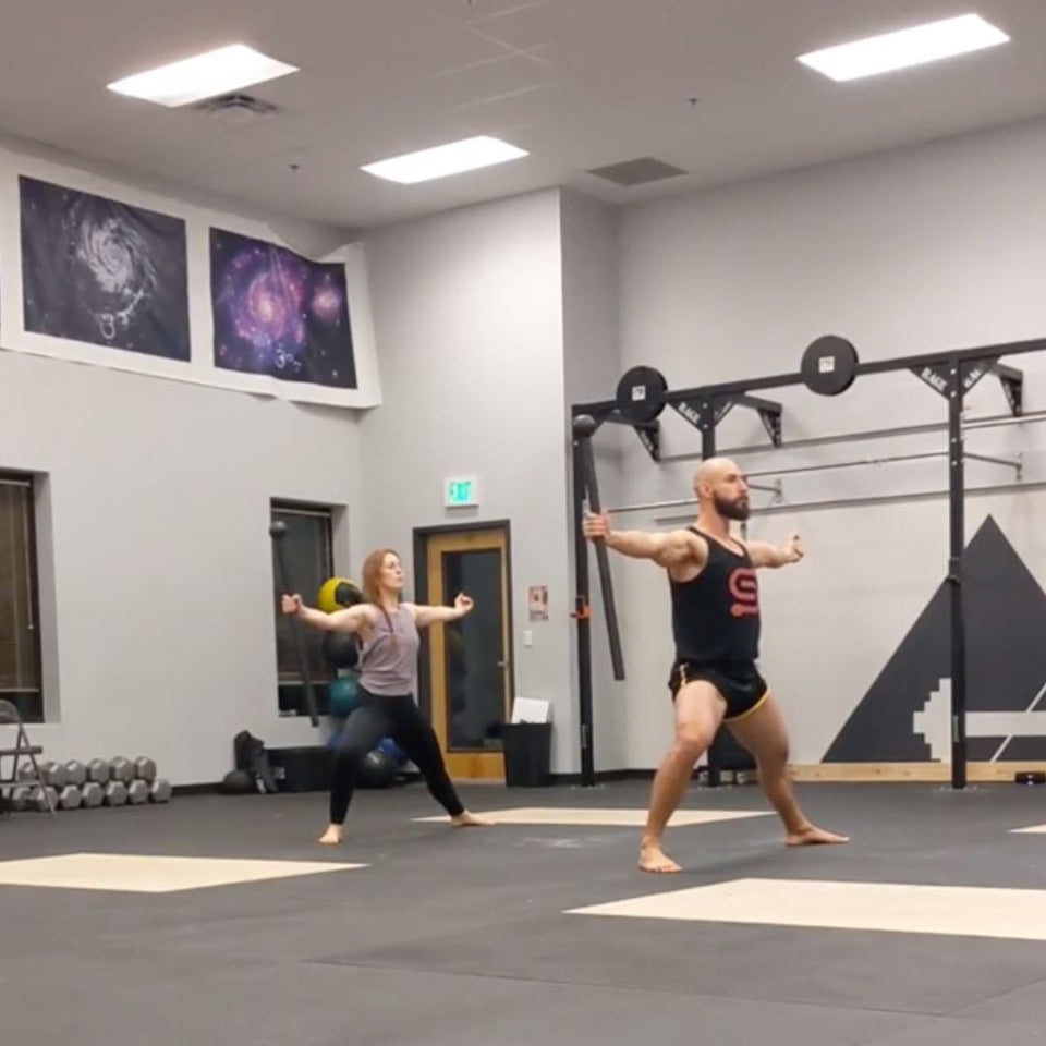 Coach Rich hitting a steel mace complex that combines multiple movements in multiple planes of motion.